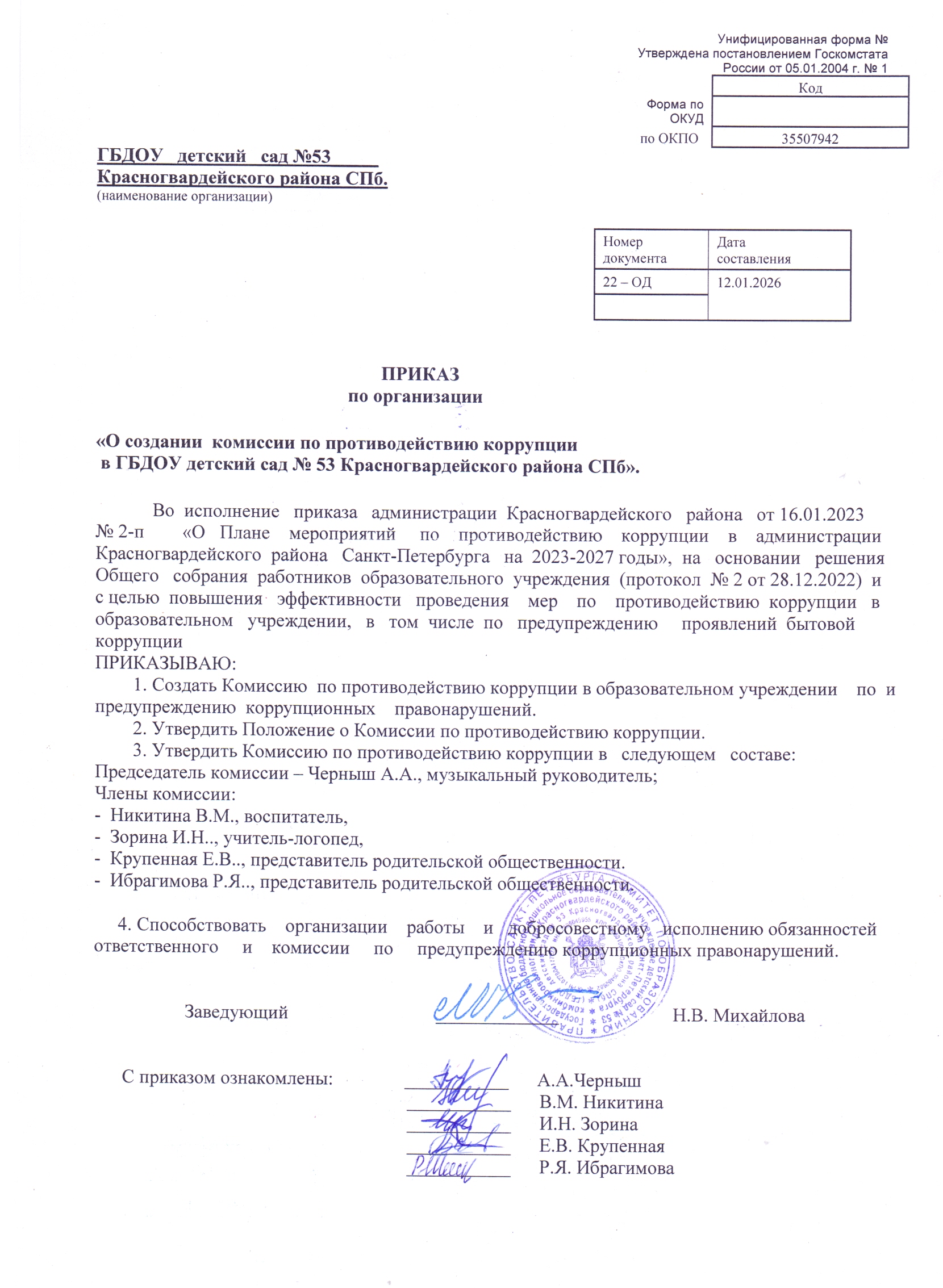 ПРИКАЗ "ОБ УТВЕРЖДЕНИИ СОСТАВА КОМИССИИ ПО ПРОТИВОДЕЙСТВИИ КОРРУПЦИИ В ГБДОУ"